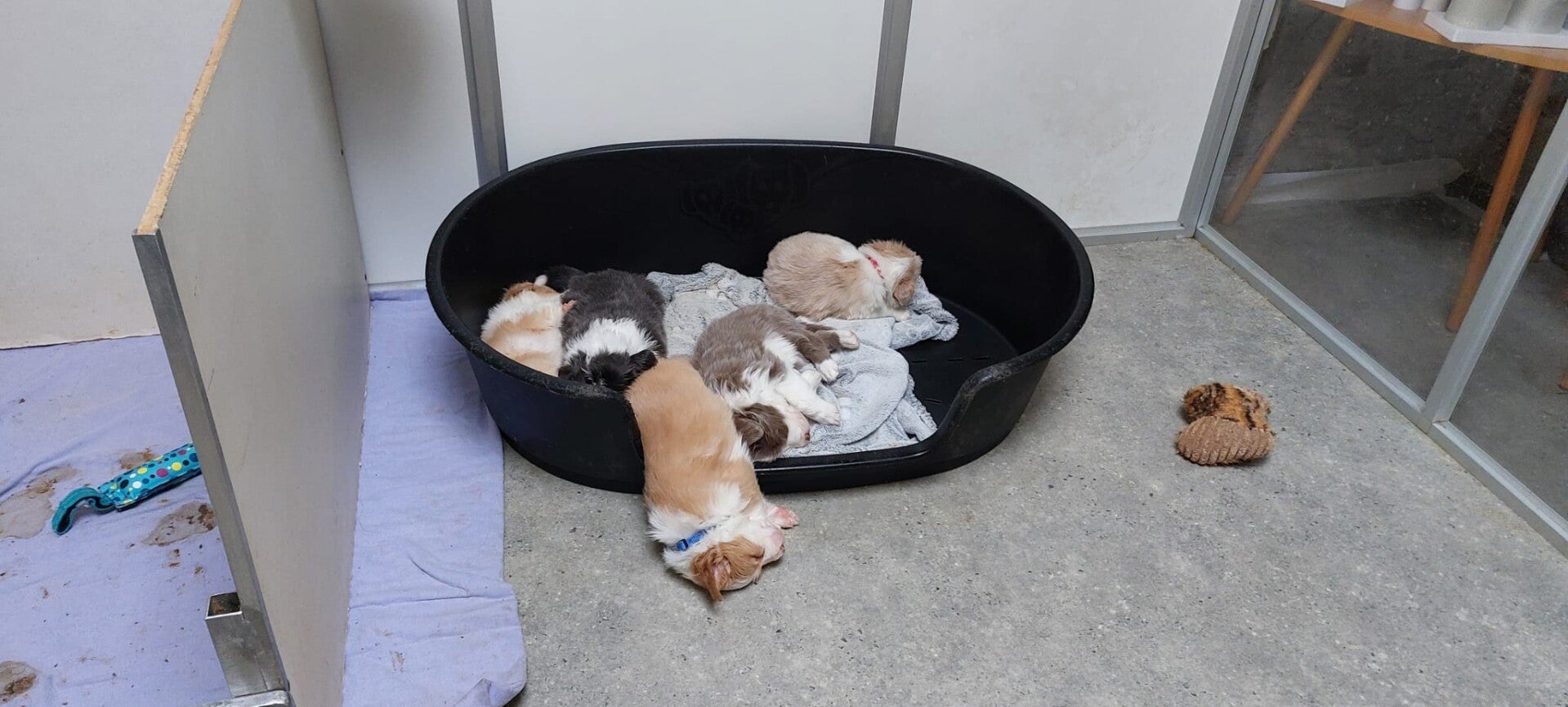 De pups van Britt zijn alweer 4 weken oud en maken mooie stappen. Ze eten nu ook vast voedsel: kleine brokjes, en dat gaat verrassend goed!